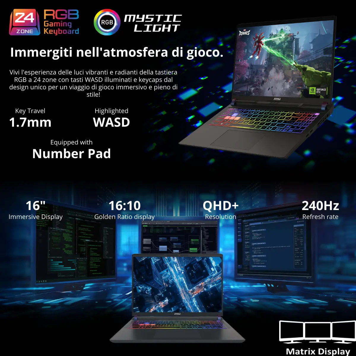 Il display 16” QHD+ (2560×1600) 240Hz IPS-Level con copertura 100% DCI-P3 offre immagini dettagliate e fluide, mentre i 32GB DDR5-5600 (espandibili fino a 96GB) e l’SSD PCIe Gen4 da 1TB garantiscono caricamenti fulminei e multitasking estremo.