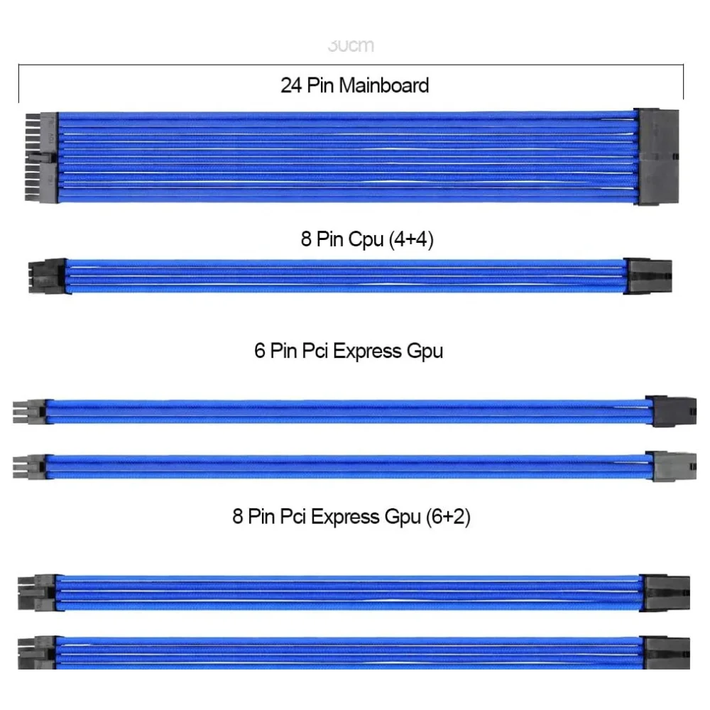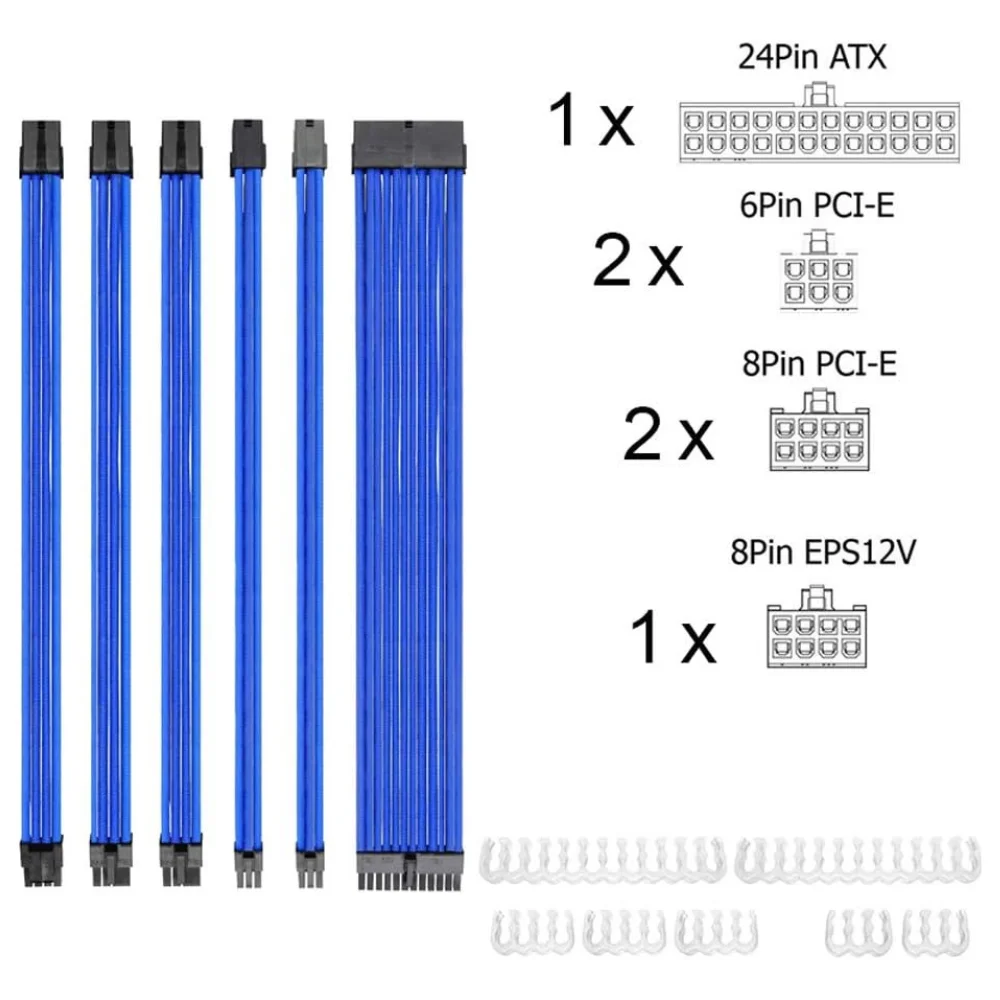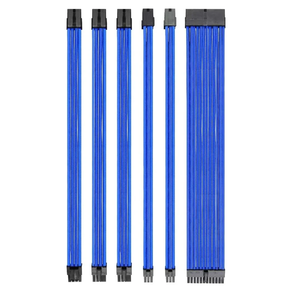 Set di prolunghe sleevate in nylon blu per alimentatori modulari. Ideale per dare un tocco elegante e personalizzato al proprio PC. Lunghezza di 300 mm con pettini inclusi per una perfetta gestione dei cavi e massima pulizia estetica all’interno del case.