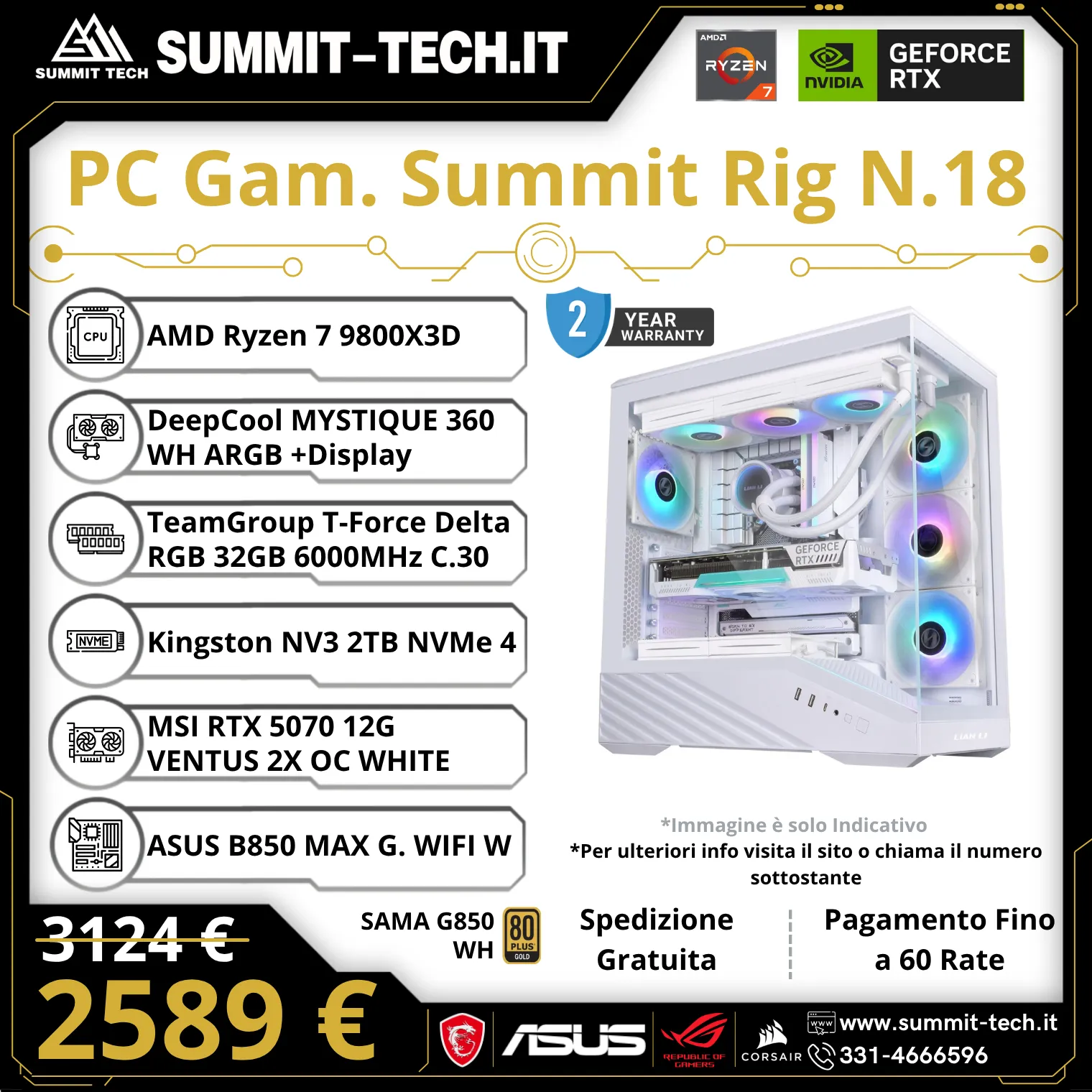 PC Gaming N.18 – Ryzen 7 9800X3D / RTX 5070 12G / 32GB DDR5 / 2TB SSD / Wi-Fi 6E / 850W / Win 11 Pro | Summit Rig