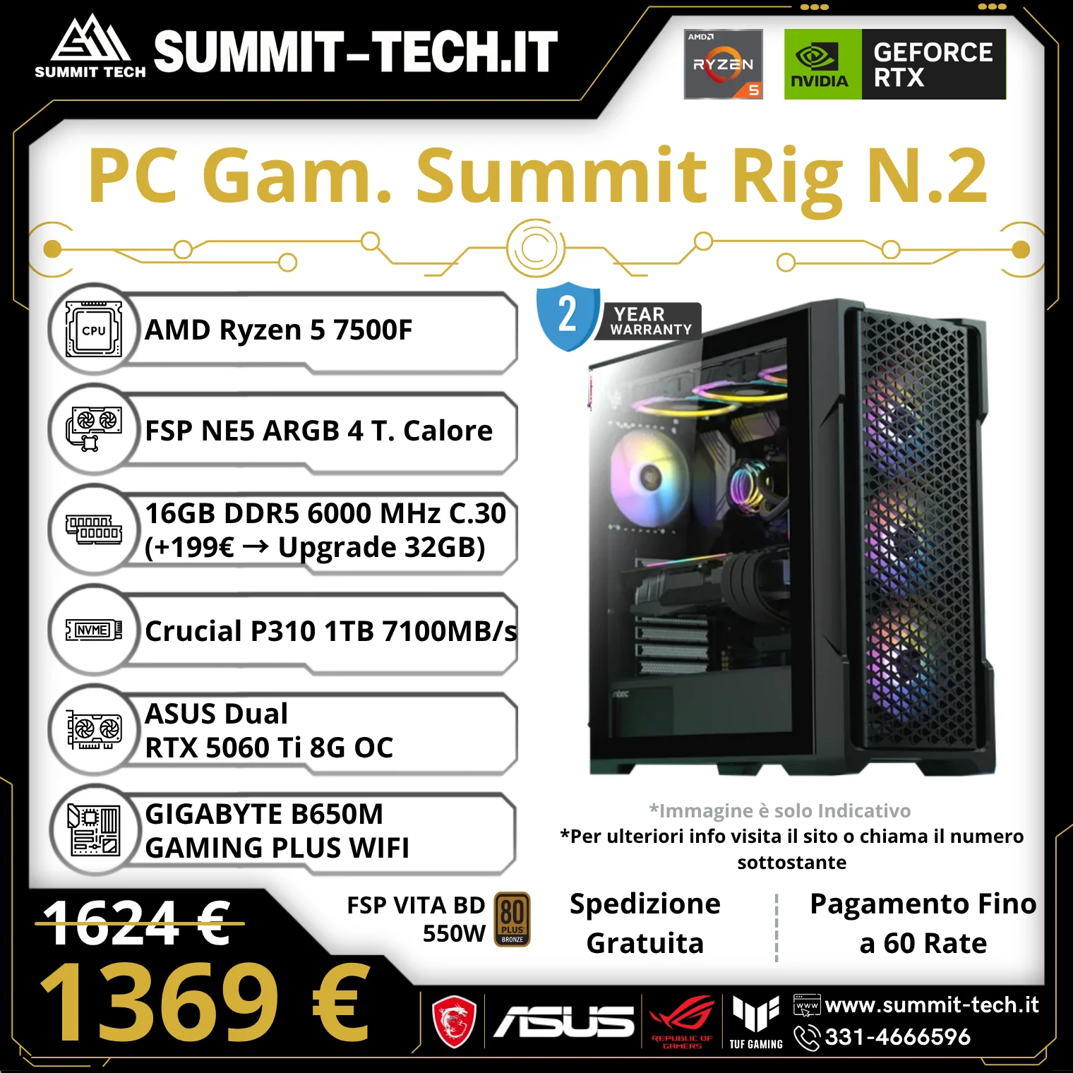 PC Gaming N.2 – Ryzen 5 7500F / RTX 5060 Ti 8G / 16GB DDR5 / 1TB SSD / Wi-Fi 6E / 550W / Win 11 Pro | Summit Rig
