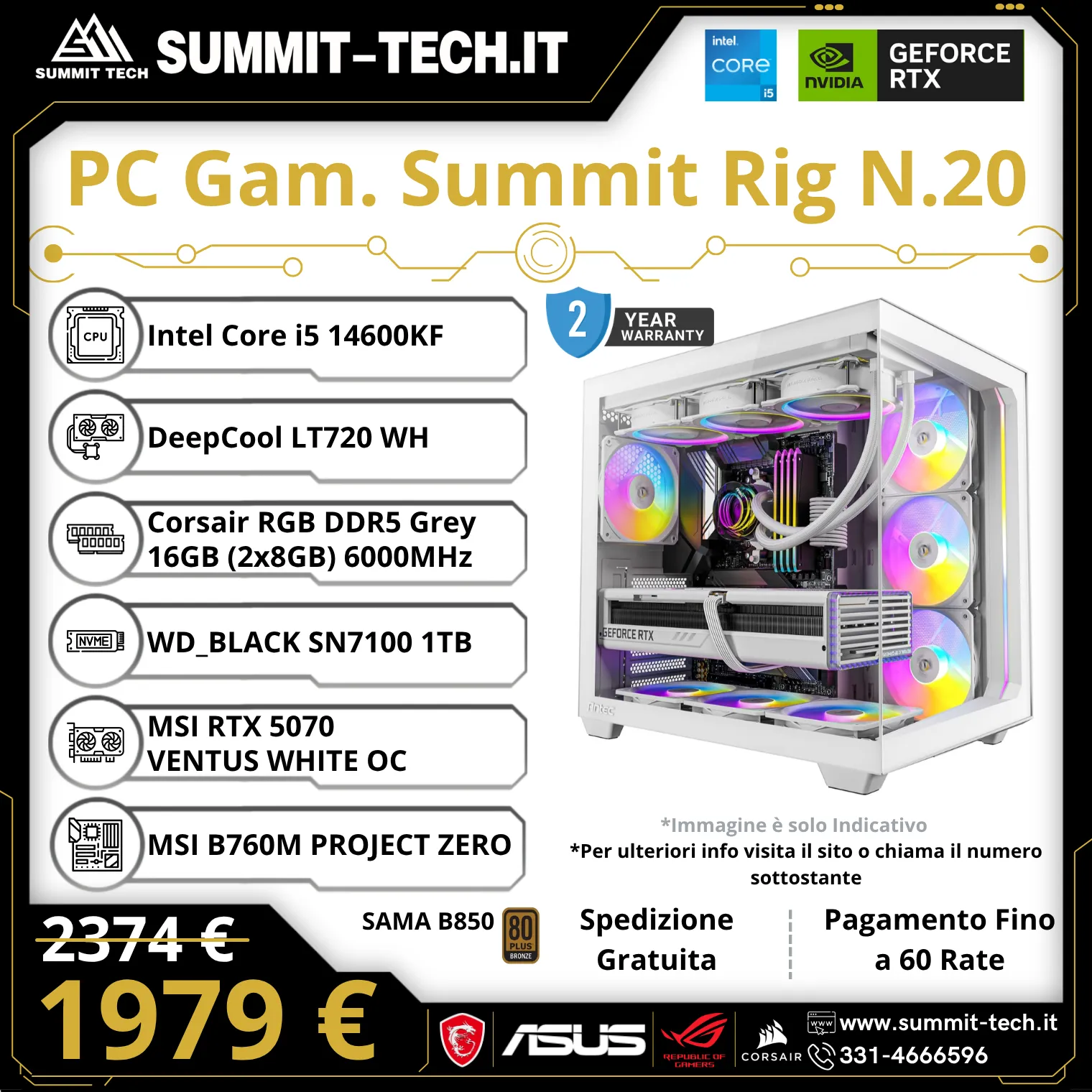 PC Gaming N.20 – i5 14600KF / RTX 5070 12G / 32GB DDR5 / 1TB SSD / Wi-Fi 6E / 850W / Win 11 Pro | Summit Rig