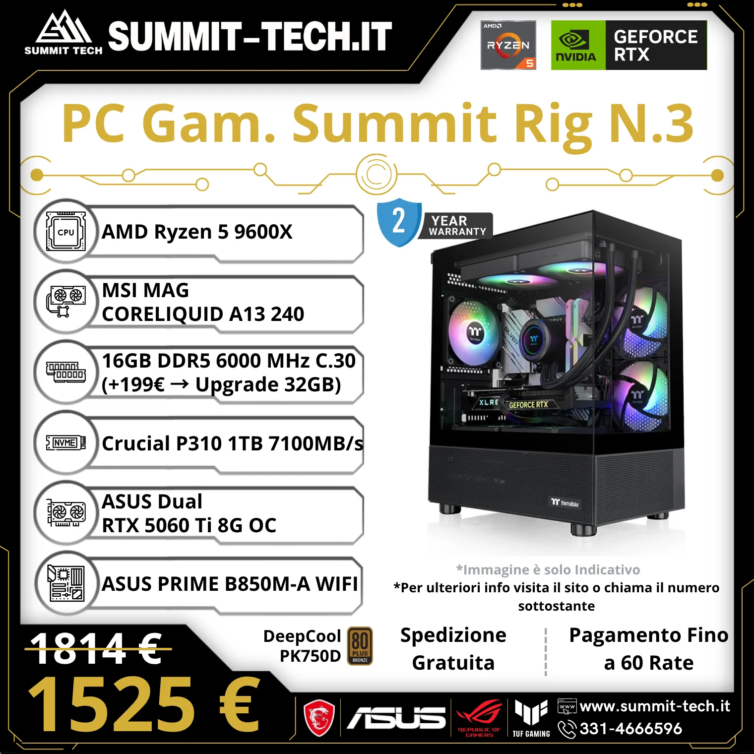 PC Gaming N.3 – Ryzen 5 9600X / RTX 5060 Ti 8G / 16GB DDR5 / 1TB SSD / Wi-Fi 6E / 750W / Win 11 Pro | Summit Rig