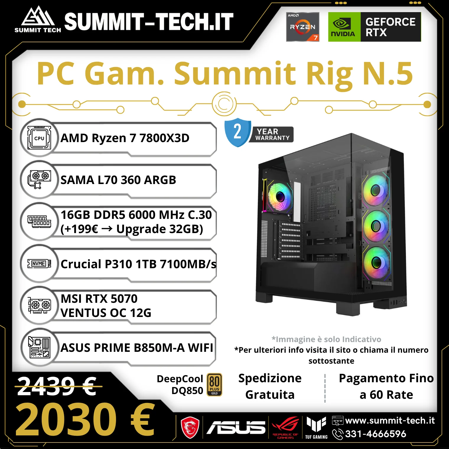 PC Gaming N.6 – Ryzen 7 7800X3D / RTX 5070 Ti 16G / 16GB DDR5 / 1TB SSD / Wi-Fi 6E / 850W / Win 11 Pro | Summit Rig