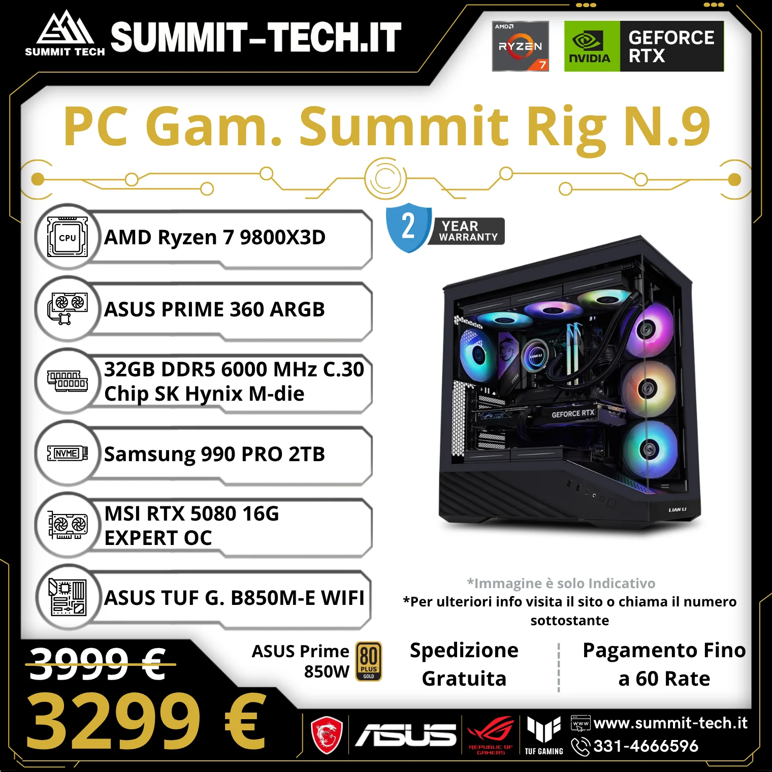 PC Gaming N.11 – Ryzen 7 9850X3D / RTX 5080 16G / 32GB DDR5 / 2TB SSD / Wi-Fi 7 / 1200W / Win 11 Pro | Summit Rig