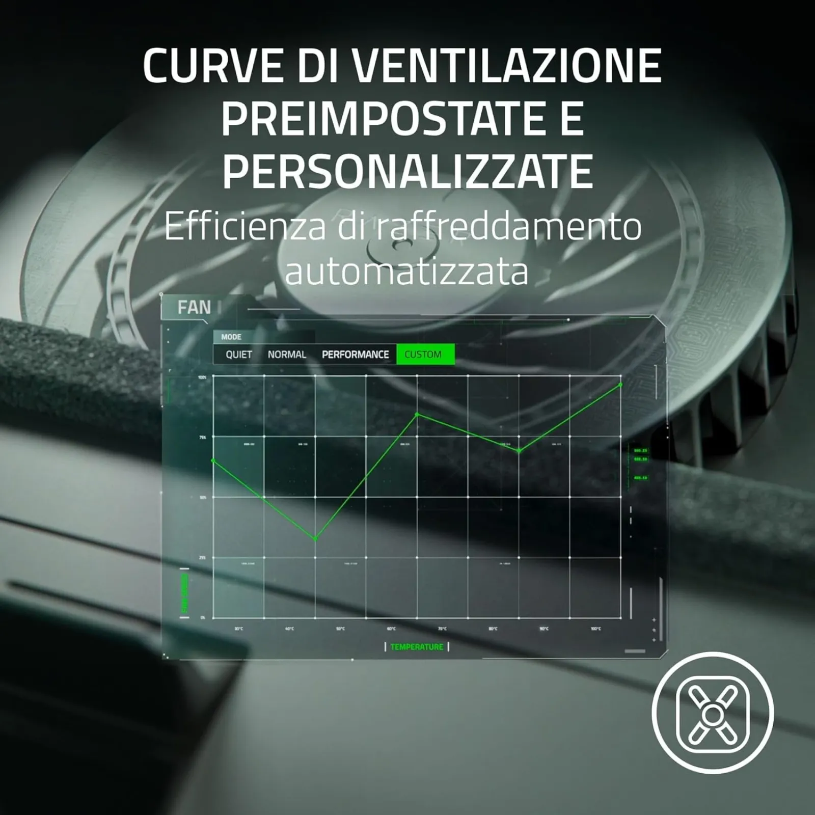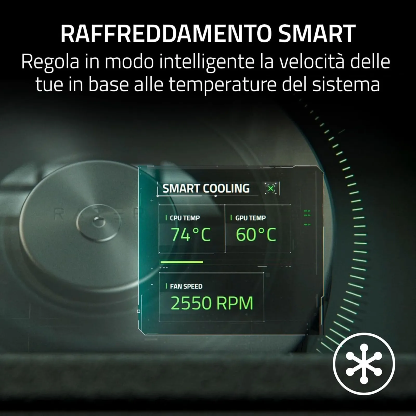 Caratteristiche del software: Modalità automatica, curve personalizzate della ventola, velocità della ventola, illuminazione e altre funzioni gestite tramite Razer Synapse 4