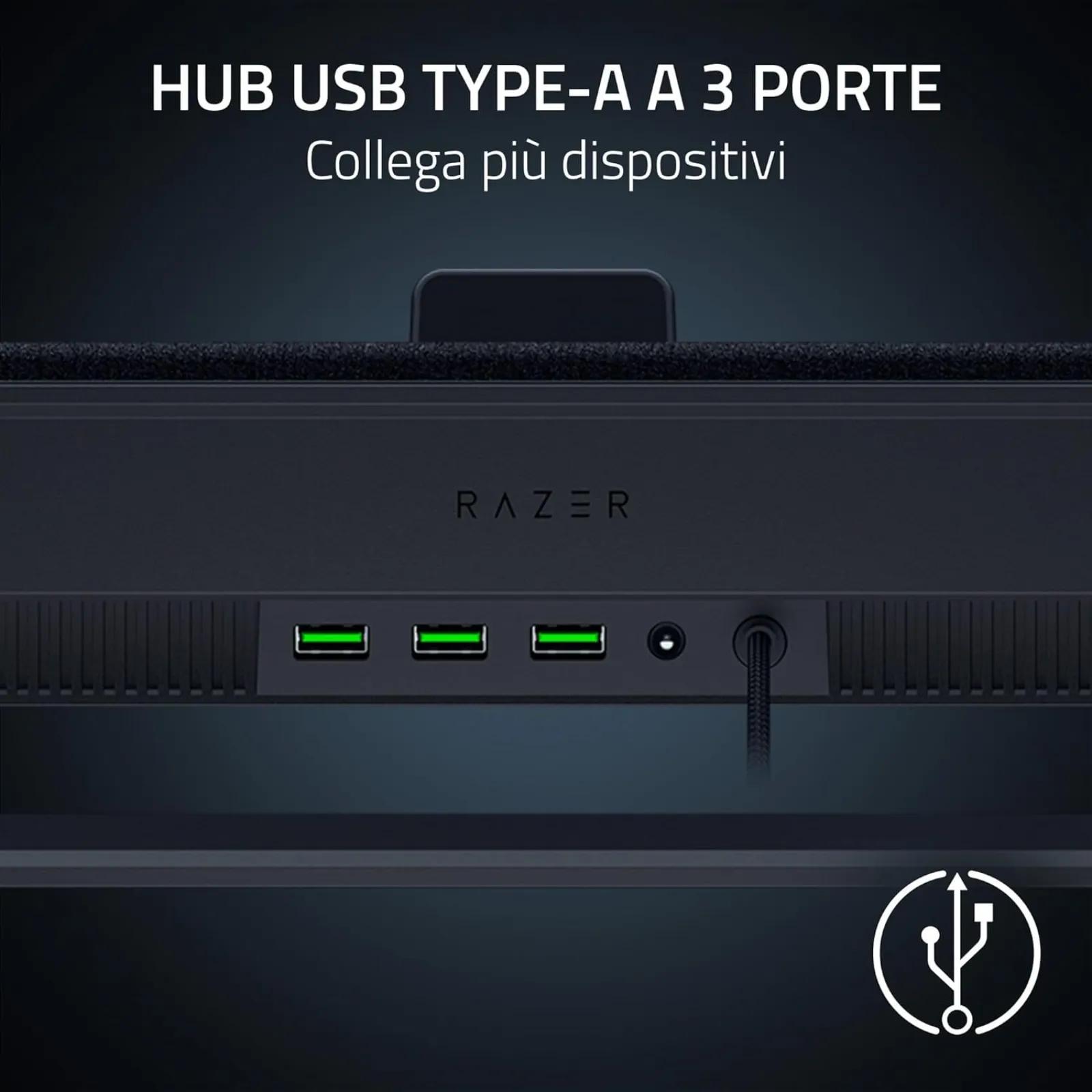 La base integra anche un hub USB con 3 porte USB-A, che consente di collegare facilmente periferiche come mouse, tastiere o unità di archiviazione.