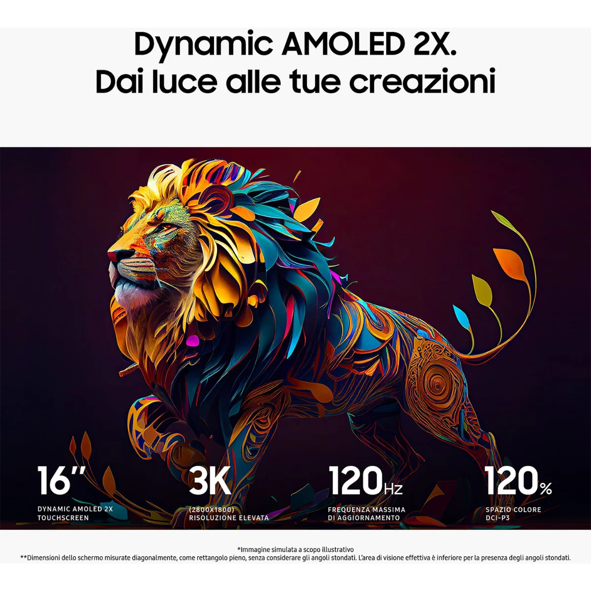 Il display 16.0” WQXGA+ AMOLED Touch (2880 x 1800) con trattamento anti-riflesso assicura colori vividi, contrasto elevato e supporto HDR, mentre l’audio AKG Quad Speakers con Dolby Atmos® regala un suono immersivo.