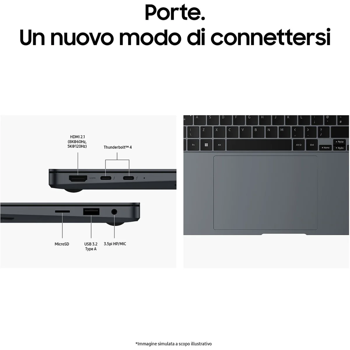 Con 16GB LPDDR5X on-board e SSD NVMe da 1TB espandibile (2 slot disponibili), la reattività è garantita. La connettività di ultima generazione include Wi-Fi 6E, Bluetooth 5.3, 2 porte Thunderbolt™ 4, HDMI 2.1 e lettore MicroSD.