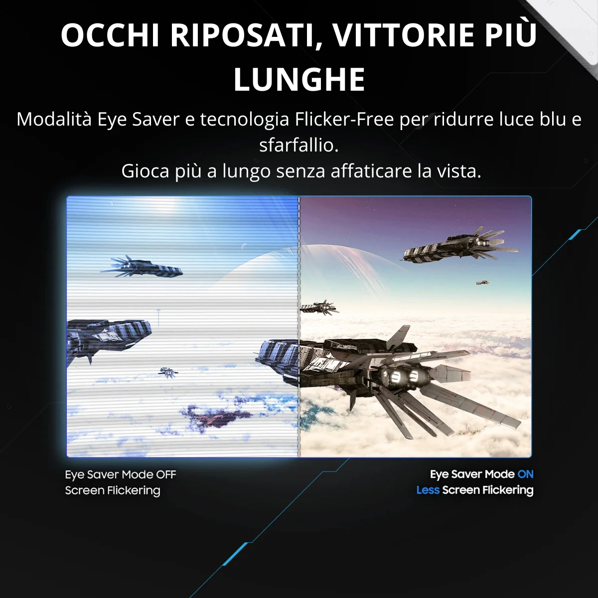 Pensato anche per le sessioni prolungate, il monitor integra la Modalità Eye Saver per ridurre le emissioni di luce blu e la tecnologia anti-sfarfallio, così da proteggere la vista durante le maratone di gioco.