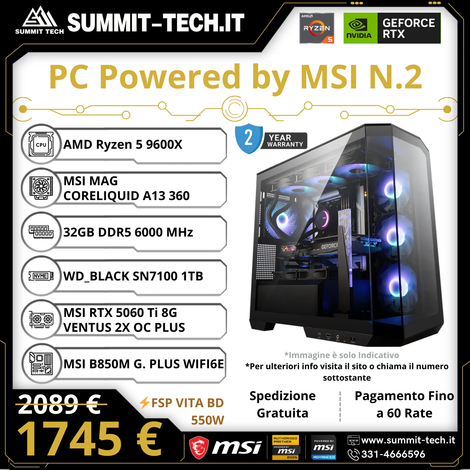 Summit PC N.2 – Ryzen 5 9600X / RTX 5060 Ti 8G / 32GB DDR5 / 1TB SSD / Wi-Fi 6E / 550W / Win 11 Pro | Powered by MSI