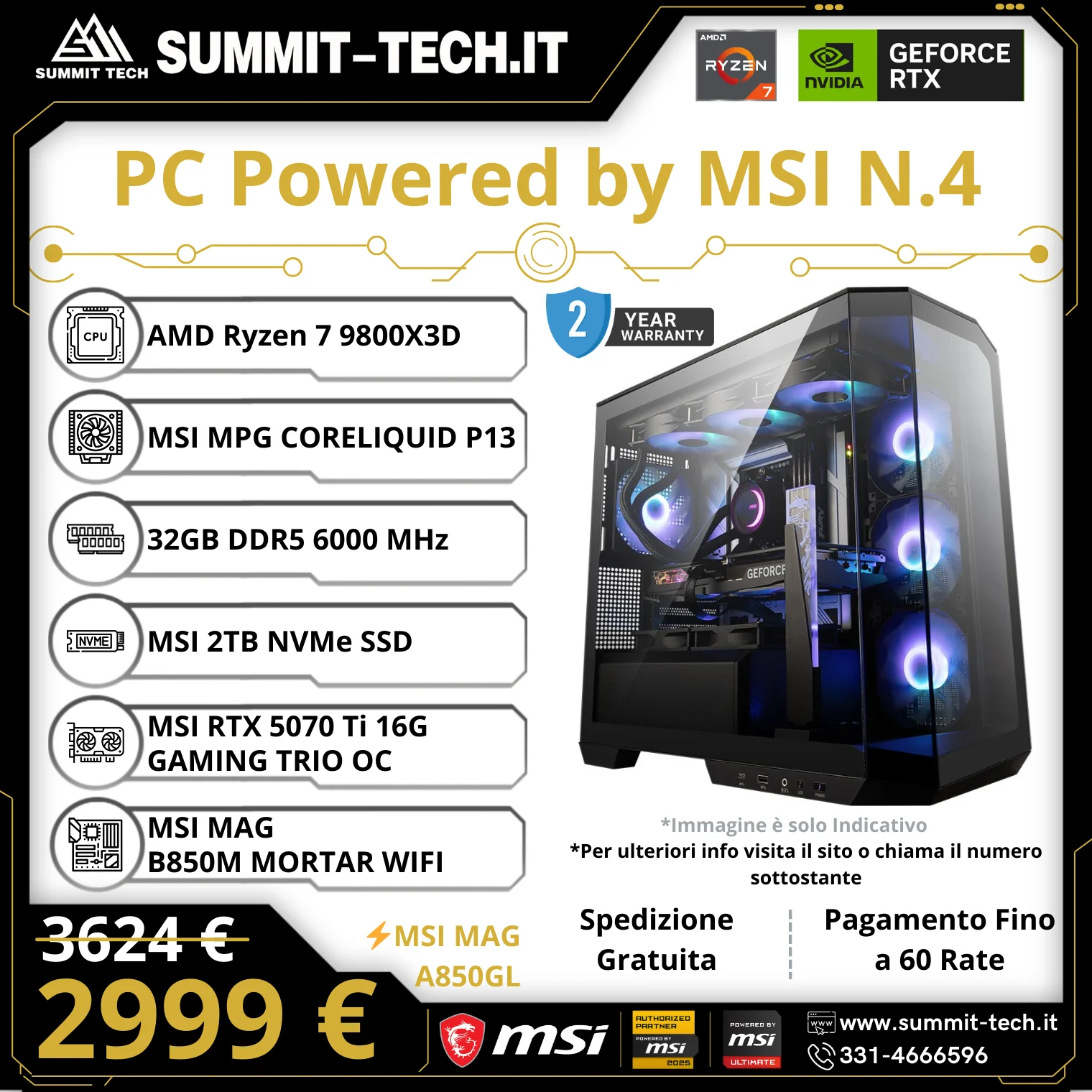 Summit PC N.4 – Ryzen 7 9800X3D / RTX 5070 Ti 16G / 32GB DDR5 / 2TB SSD / Wi-Fi 7 / 850W / Win 11 Pro | Powered by MSI