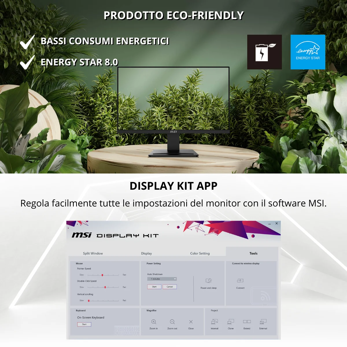 Grazie alle funzioni Eye-Q Check e al software MSI Display Kit, puoi personalizzare le impostazioni in pochi clic e monitorare il tuo benessere visivo. Con porte HDMI e DisplayPort, supporto VESA e montaggio senza utensili, il monitor garantisce massima flessibilità e semplicità d’uso.