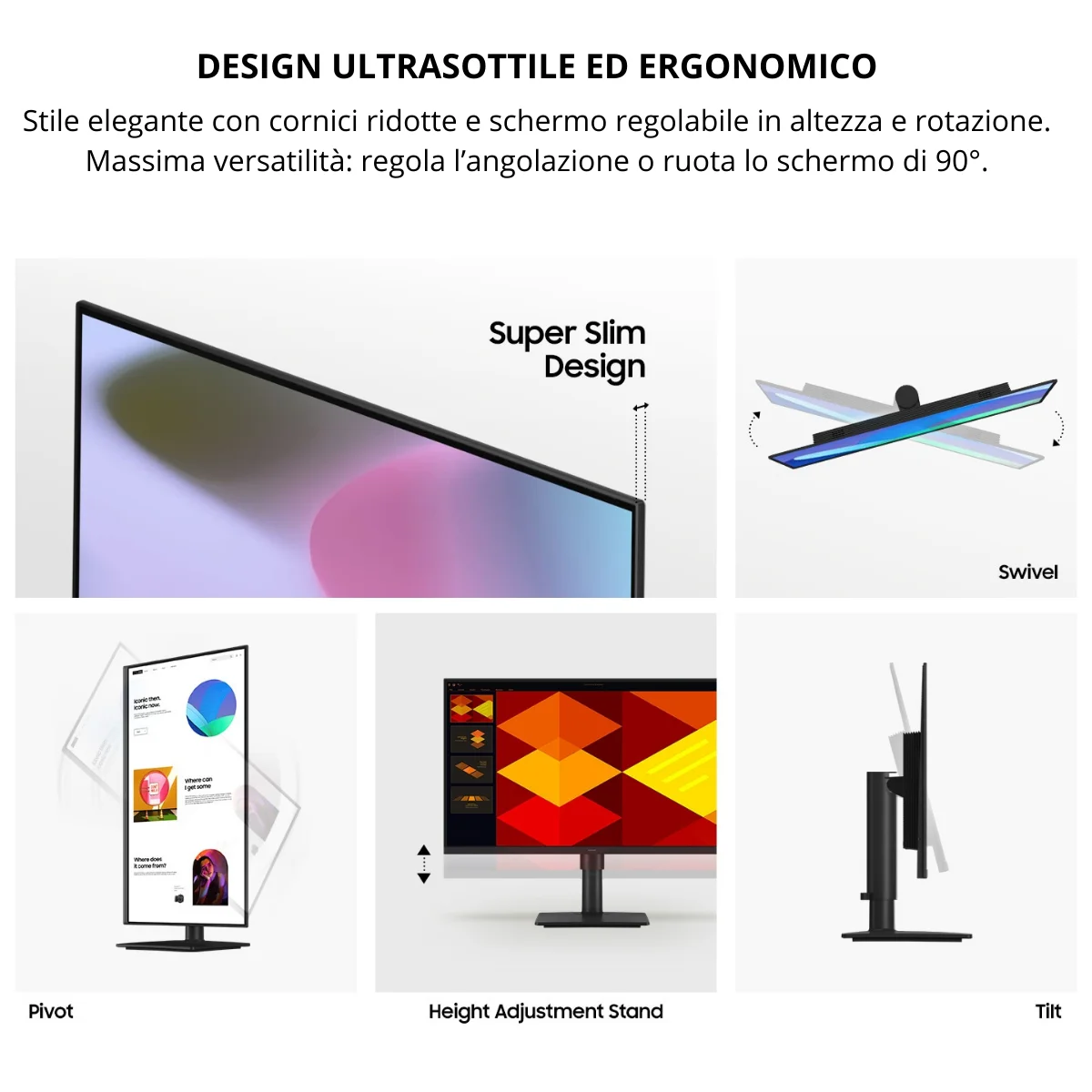 Design ultrasottile ed ergonomico, regolabile in altezza e orientabile fino a 90°