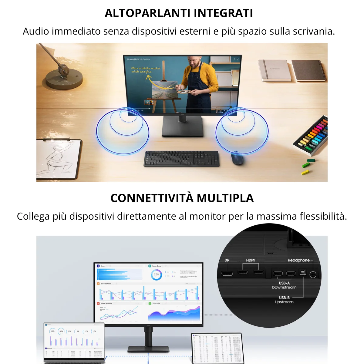 Il suo design ultrasottile ed ergonomico permette regolazioni in altezza, rotazione e inclinazione per adattarsi perfettamente a qualsiasi postazione. Con altoparlanti integrati e ampia connettività (HDMI, DisplayPort, ecc.), riduce l’ingombro e aumenta la praticità.